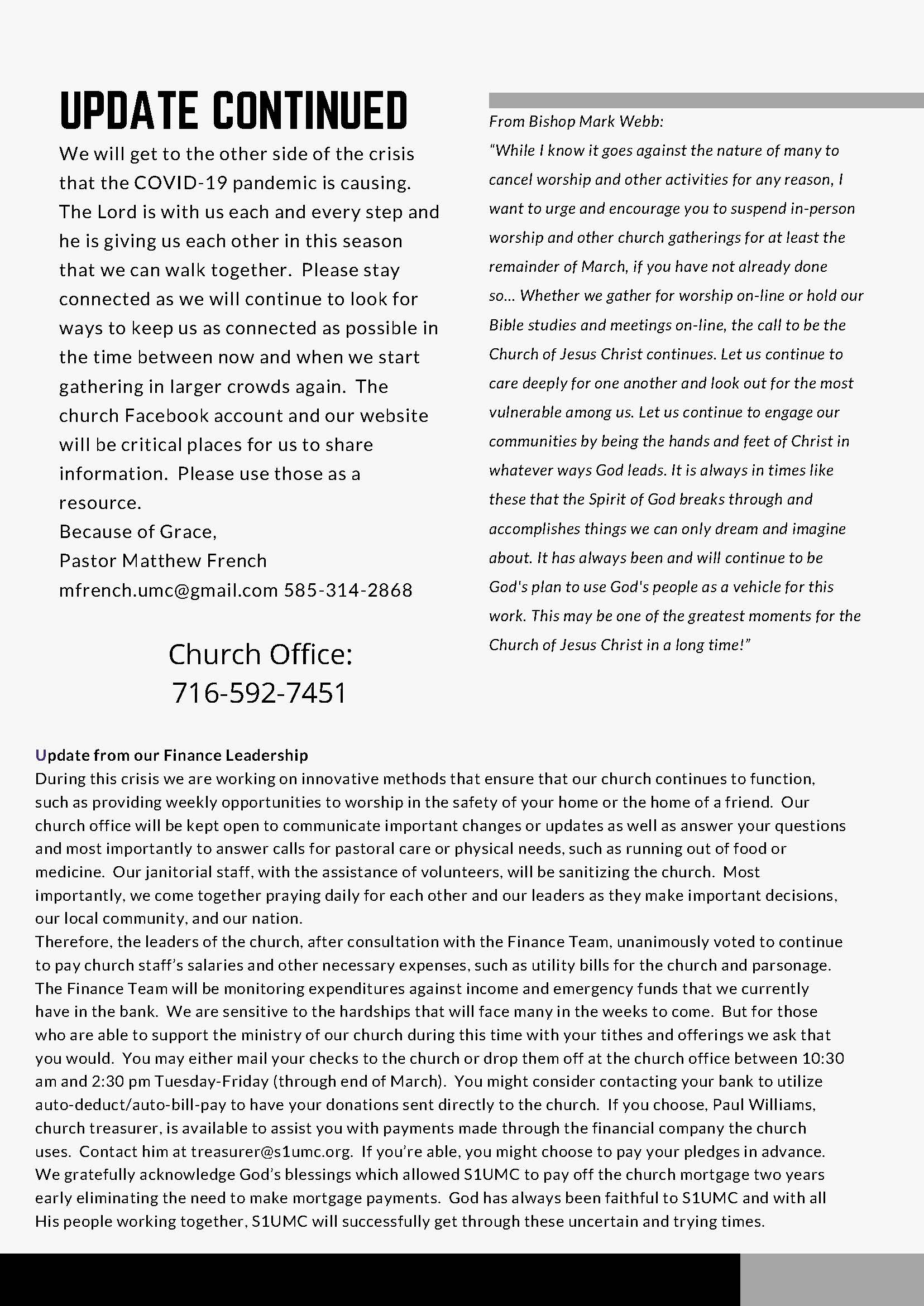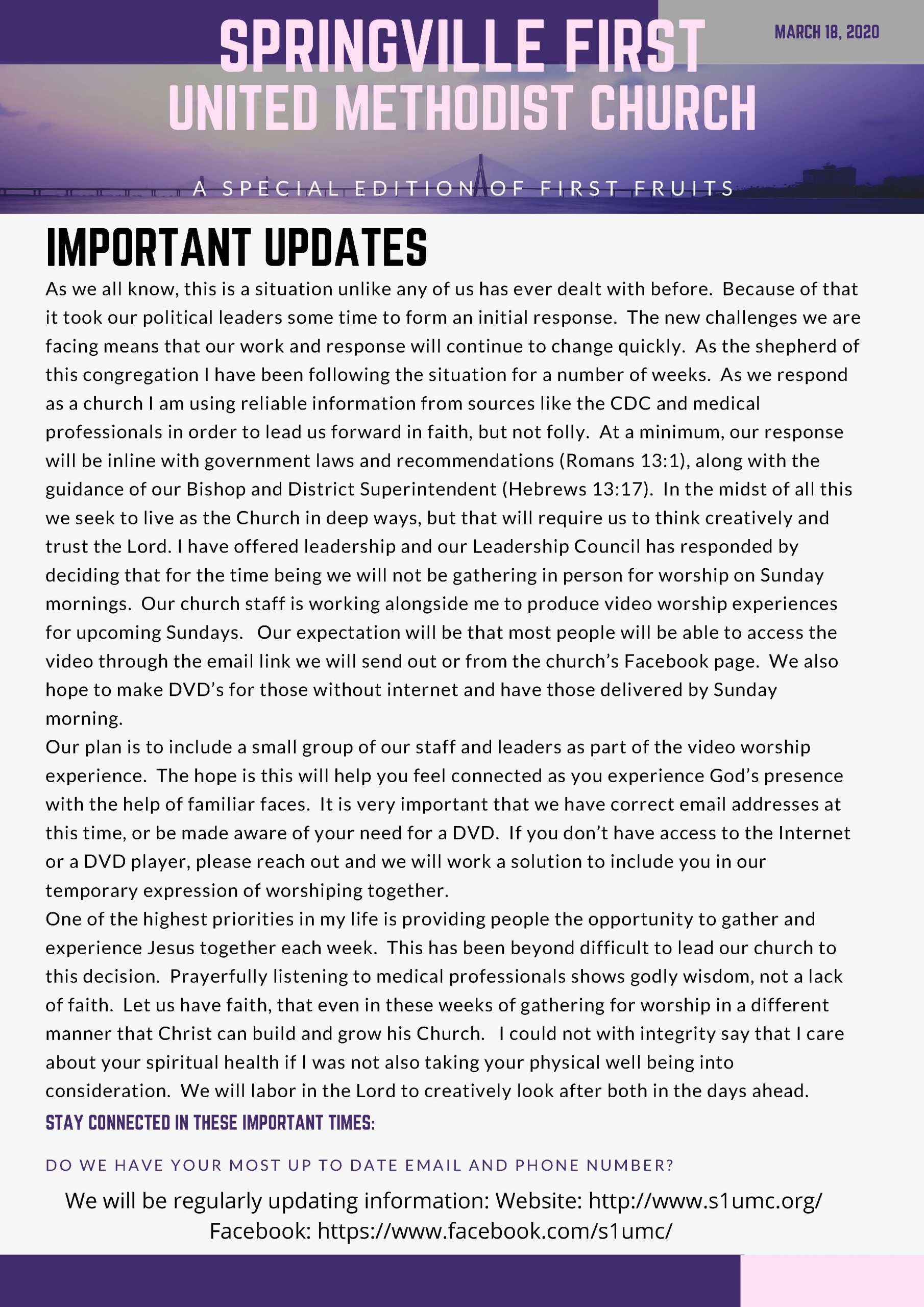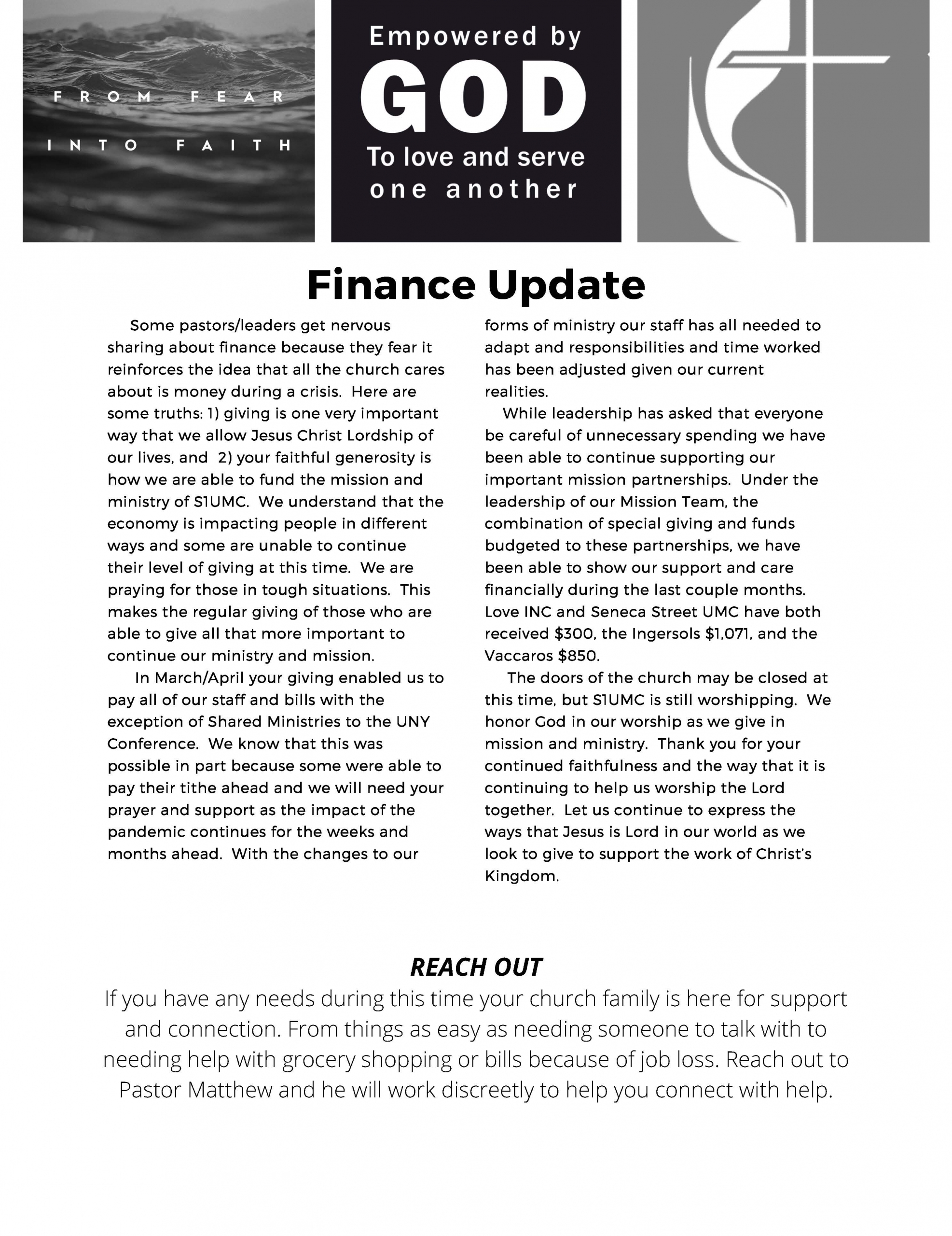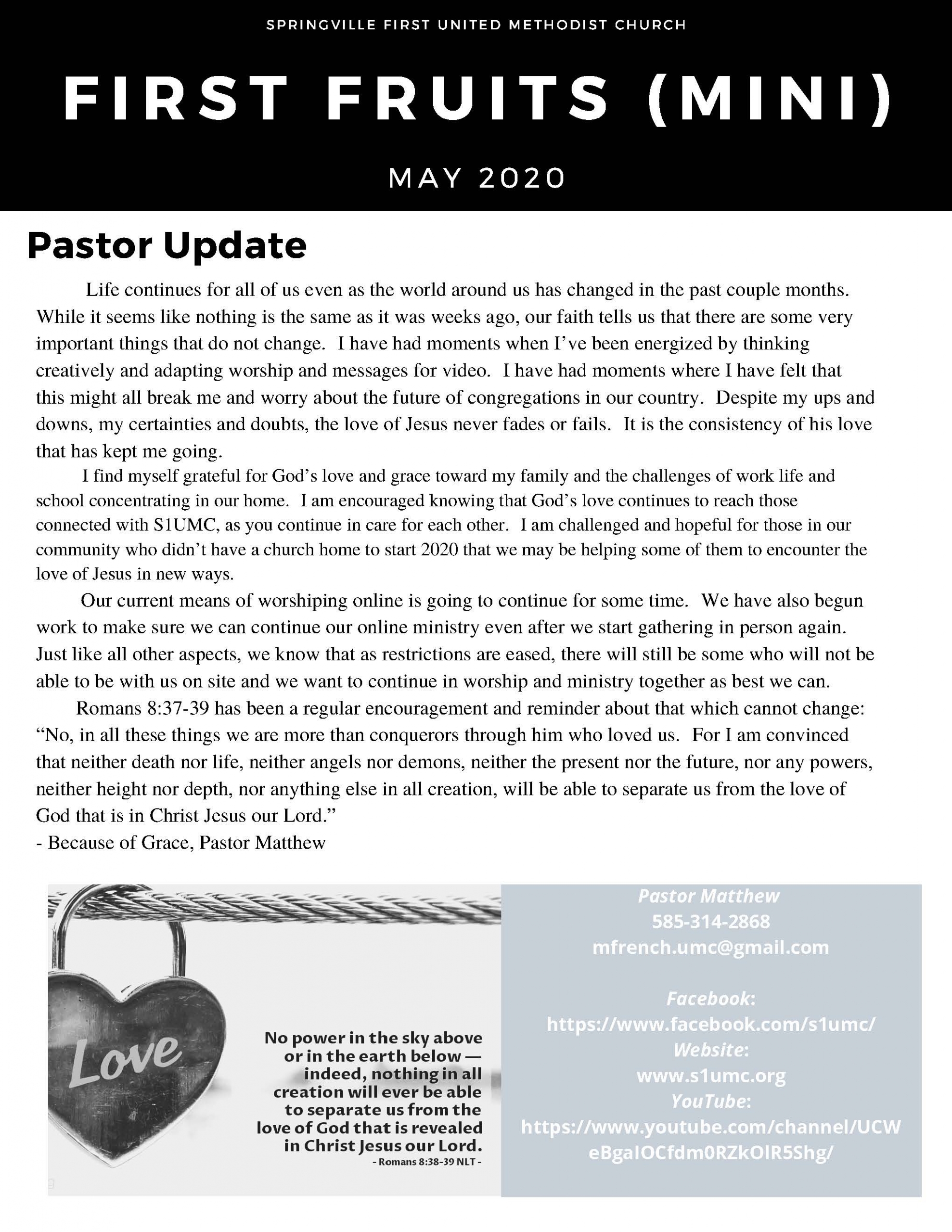 Pastor Matthew is appreciative of the prayer and work that has gone into our process of being the church while we have not been meeting in person and now in the process of gathering again. Please continue to pray for him and our church that Christ will use us to reach new people in this time of crisis. Specific thanks to those who are helping serve on the Reopening Team: Jason Harrington, Mike Lux, Bart Moody, Dave and Debe Ploetz, and Lois Scharf-Newman.