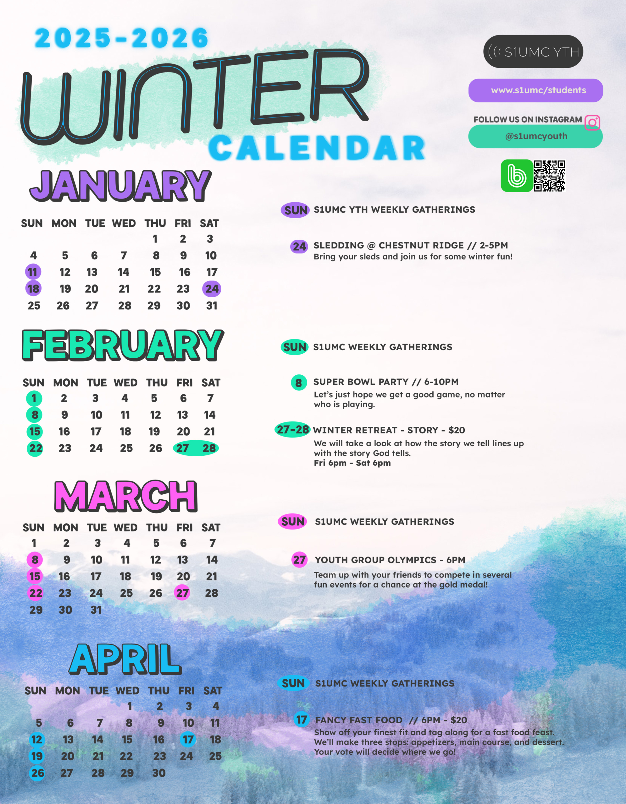 We desire to come alongside students to equip them to grow closer to God and each other. Our primary means to growth is through our Sunday evening gathering time. We meet from 6-8pm during the school year, and all students in grades 6-12 are encouraged to attend. If you have any questions, you can call the church office at (716) 592-7451 or e-mail luke@s1umc.org.